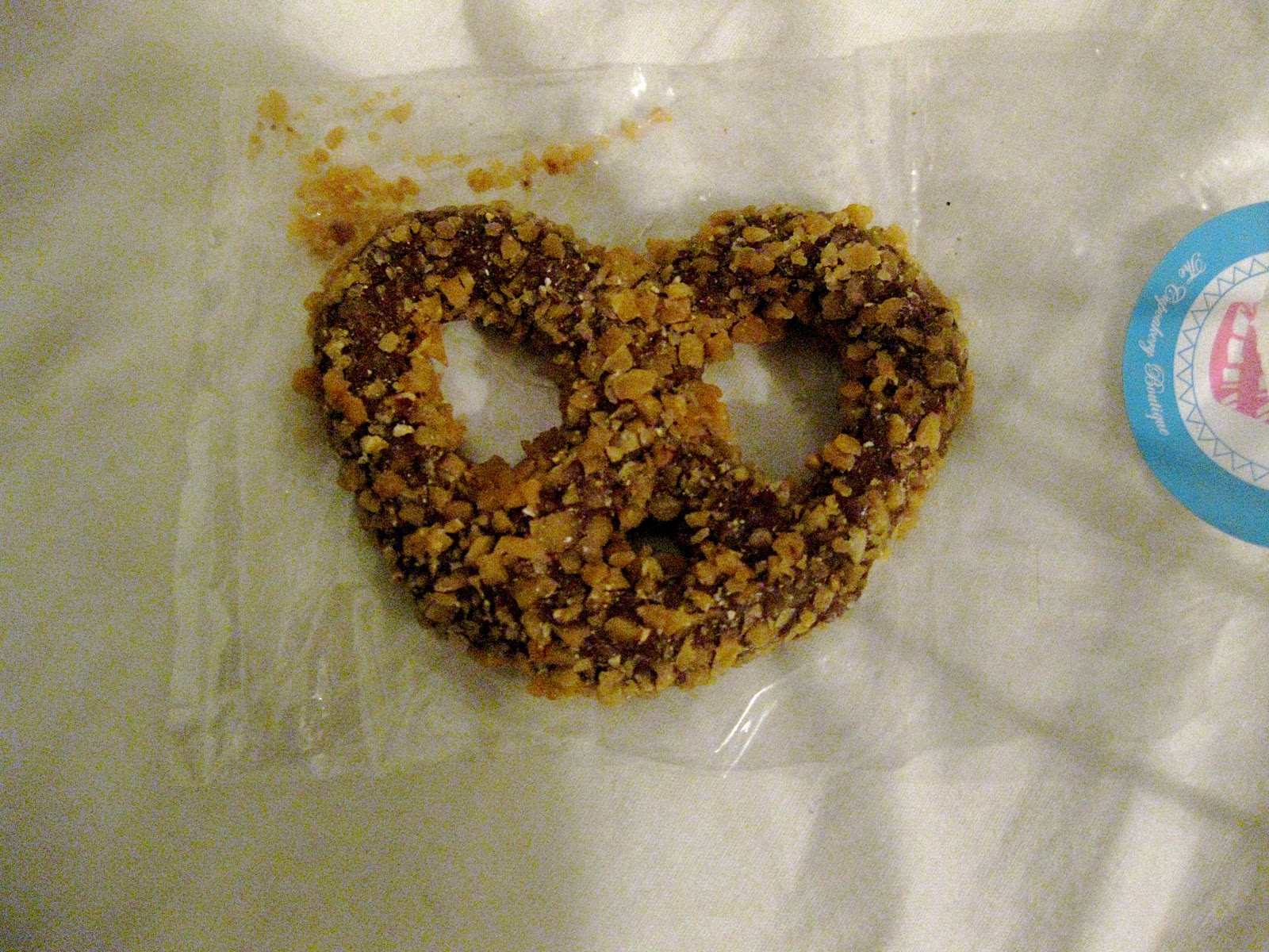 J’ai acheté un Bretzel trempé dans du chocolat et enrobé de Heath (une espèce de Daim américain). J’aurais bien pris une photo mais euh… Mr Mine a tout mangé… EDIT 17 nov.: Et non finalement il l’avait encore dans sa poche: